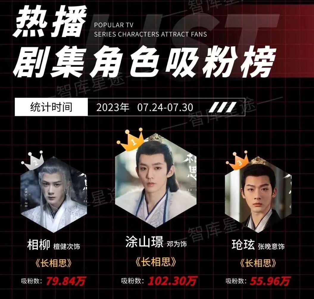 《长相思》播出期间,邓为、檀健次、张晚意吸粉量(图源:智库星途)
