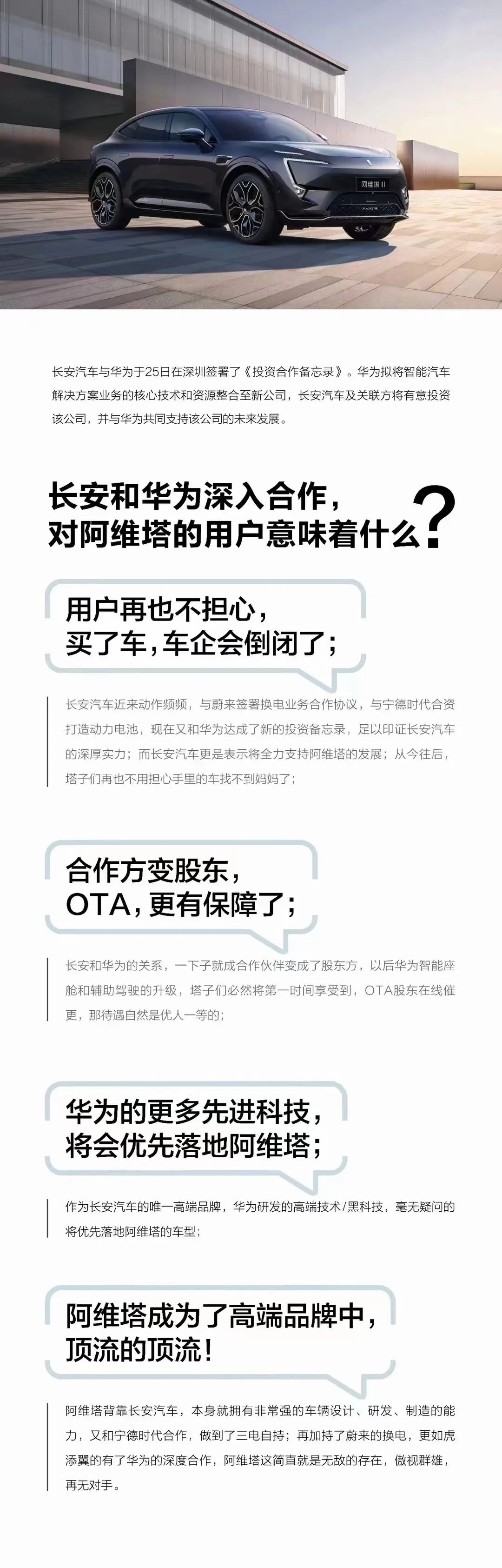 至于已经官宣将投资新公司的长安旗下品牌阿维塔,发布了一张长海报,提到2点影响:
