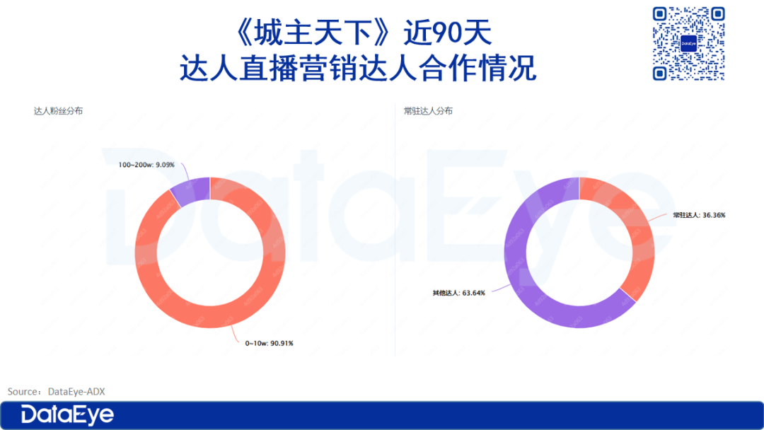 近90天《城主天下》项目组合作达人0-10W粉丝的中腰部主播占比高达90%左右,100-200W粉丝的头部主播占比9%左右;《城主天下》常驻达人占比达36%。