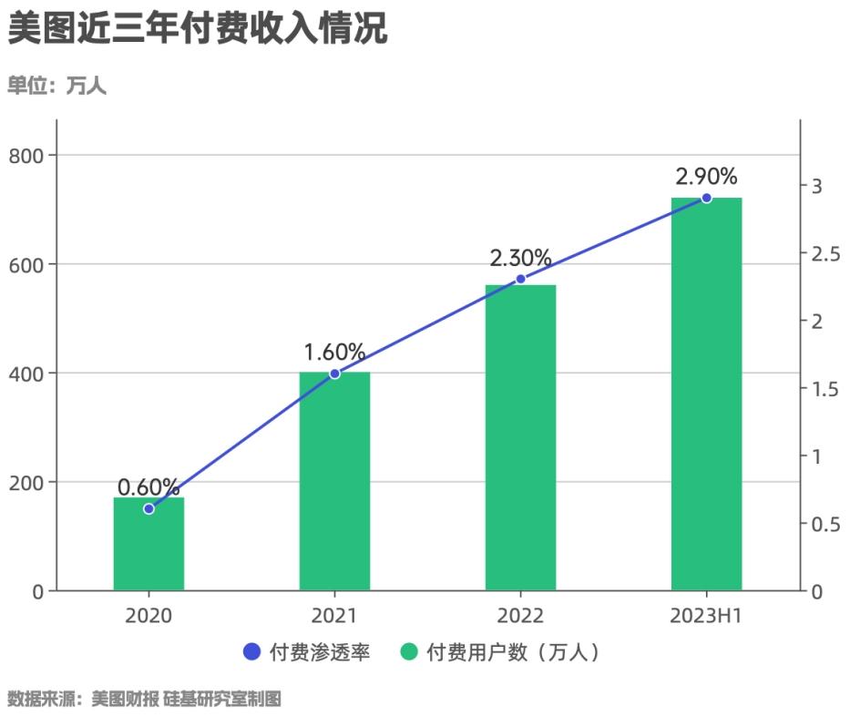 最后在商业模式上,2020年下半年美图在国内推出VIP订阅服务,从免费转向订阅制。 仅从近三年财报基本面表现来看,订阅业务已超过在线广告业务成为美图首要的收入来源,订阅业务的付费渗透率也从2020年的0.6%攀升至2.9%。
