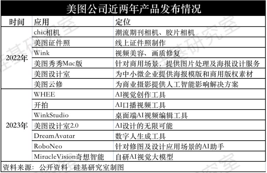 其次,在产品矩阵上,美图也开始聚焦细分赛道。 2022年至今,在自己擅长的影像赛道,美图推出了13款产品。比如,主打胶片和主题相机的Chic相机,Wink则关注视频美容和画质修复。同时,针对小B类专业级用户,美图推出了美图设计室和美图云修,前者商业图片设计,客群主要针对电商行业;后者则面向影楼行业,提供一站式AI修图能力。