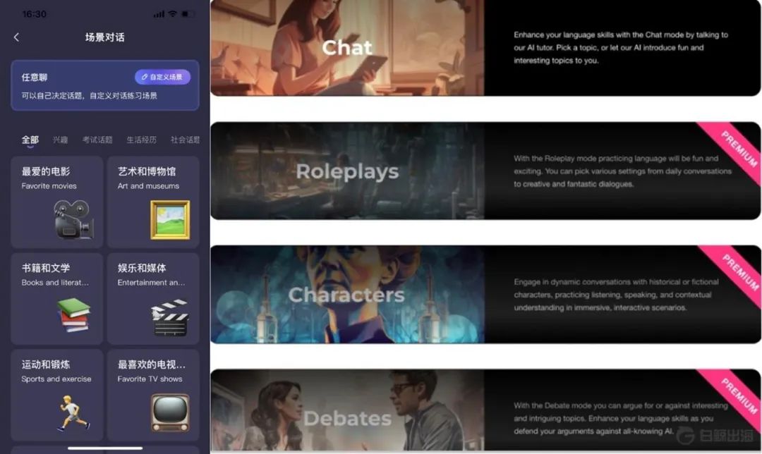 为了避免用户不知道与 AI 聊些什么,这些产品一般都会给用户提供很多可以选择的主题和场景,一方面限定场景能更有针对性的进行练习,另一方面也是考虑到备考雅思、托福等英语考试的用户有按主题练习口语的需求。此外,TalkPal 还提供与历史上角色进行对话的功能和辩论功能,以增加学习的趣味性,也是 AI 泛用性的一个体现。