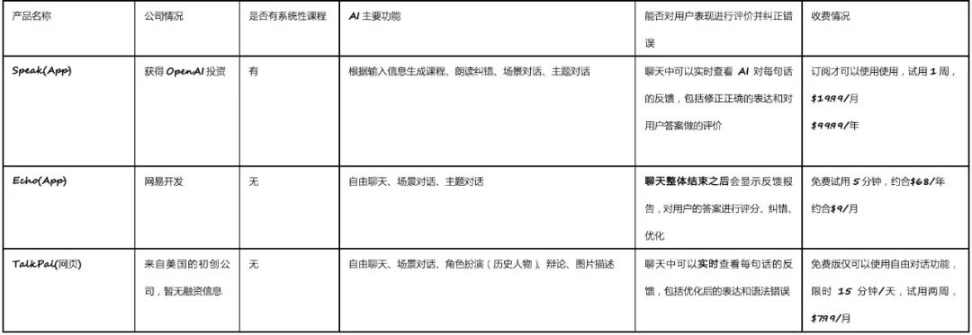笔者结合网友评价和朋友推荐,选择了 TalkPal、OpenAI 投资过的 Speak、网易推出的 Hi Echo 三款产品,进行了一轮体验。AI 口语陪练是 3 款产品的核心功能,形式上和 ChatGPT 等 AI 聊天软件差不多,用户在对话框中语音输入与 AI 进行对话,AI 会使用文字+语音的形式回应,达到练习口语的目的,相应的,这些产品会加入一键翻译、纠错等方便用户学习英语的功能。