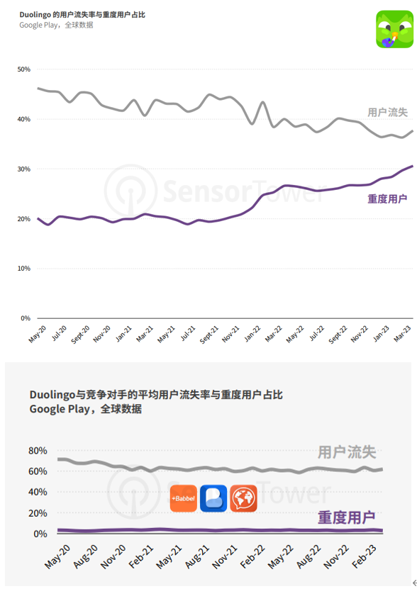 Duolingo(上)和主要竞品(下)的用户流失和重度用户对比,注:重度用户是指 1 月内打开应用超过 15 天的用户|图片来源:Sensor Tower