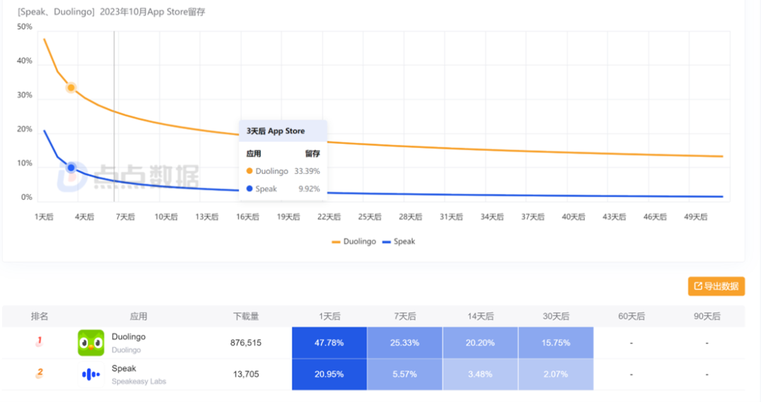 Duolingo 和 Speak 的人均启动次数、人均使用时长和留存数据对比 | 图片来源:点点数据