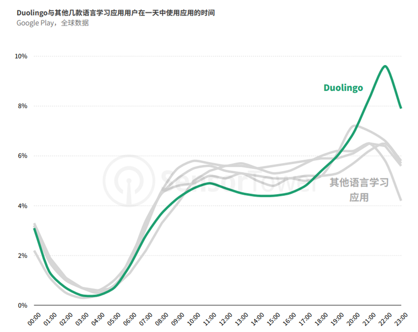 Duolingo和其他语言学习应用使用时间段对比|图片来源:Sensor Tower
