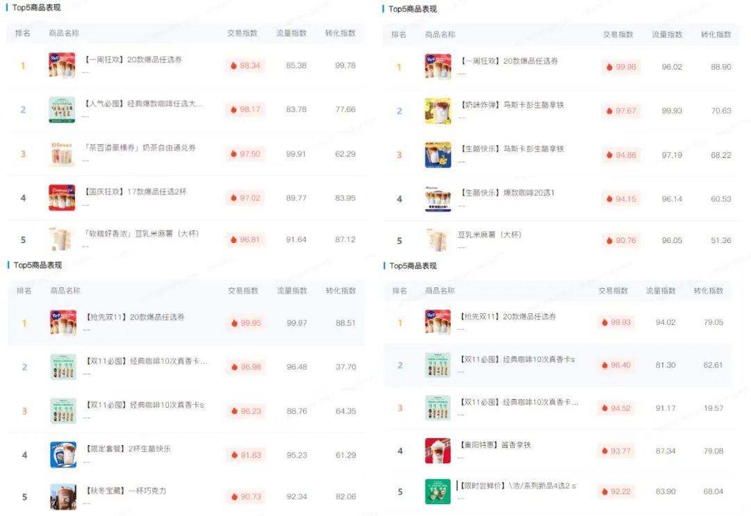 瑞幸作为抖音本地生活新茶饮运营较成熟的品牌,在提高核销率上有自己的一套打法。从10月份抖音生活服务饮品行业TOP5商品表现可以看到,瑞幸的【20款爆品任选券】交易指数始终霸王第一,【17款爆品任选2杯】、【爆款咖啡20选1】的同类型团购产品也分别上榜,其次是一些低折优惠的热门单品,如酱香拿铁、马斯卡彭生酪拿铁等,购买并核销能得到联名贴纸或者专属杯套。