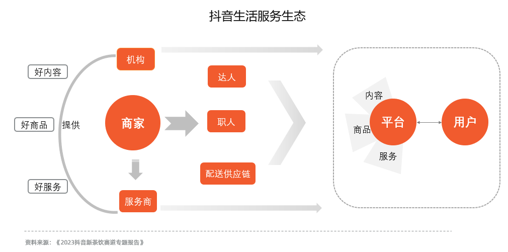 在抖音生活服务的生态体系中,商家提供商品和服务,通过自己或借助达人、服务商的能力,利用短视频、直播等手段,创作并传播优质内容,吸引用户下单。因此,抖音生活服务中新旧品牌的交替、商家选择何种投放方式、以及品牌的发展态势,均是平台、商家、达人等多方博弈的结果。