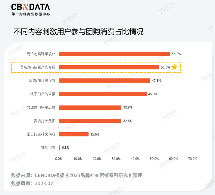 近两年,抖音的探店视频推流不断增加,与本地生活相关的团购以“低价”机制提高转化率。显然抖音试图用“内容+低价种草”的方式抢夺用户,但对于客单价低、社交属性强的茶饮品类而言,向“下”卷的通路已然非常拥挤,借内容向“外”破圈成为吸引新客的重要手段。《2023品牌社交营销系列研究》报告显示,52.5%的用户认为首店/新店/新产品的内容会刺激自己参与团购,从内容属性上看,“新鲜感”会刺激用户冲动下单,这也给一些新锐品牌带来了机会。