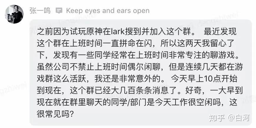 这种认知首先来自于张一鸣。其中一个出圈的梗,来自其在对员工在上班时间玩米哈游产品《原神》的质疑。