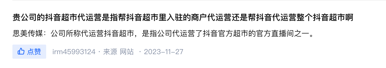 而思美传媒也在盘后的一则回复中进一步解释称“公司所称代运营抖音超市,是指公司代运营了抖音官方超市的官方直播间之一。”