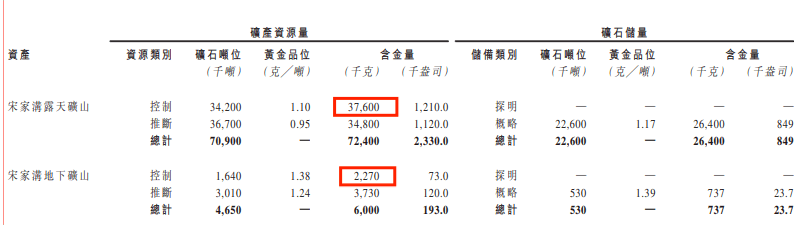 其中,宋家沟露天矿山已经控制的矿石资源量为3420万吨,含金量为37.6吨。宋家沟地下矿山矿石资源量较为稀少,已经控制的含金量仅为2.27吨,两家矿山合计控制的黄金量还不到40吨。