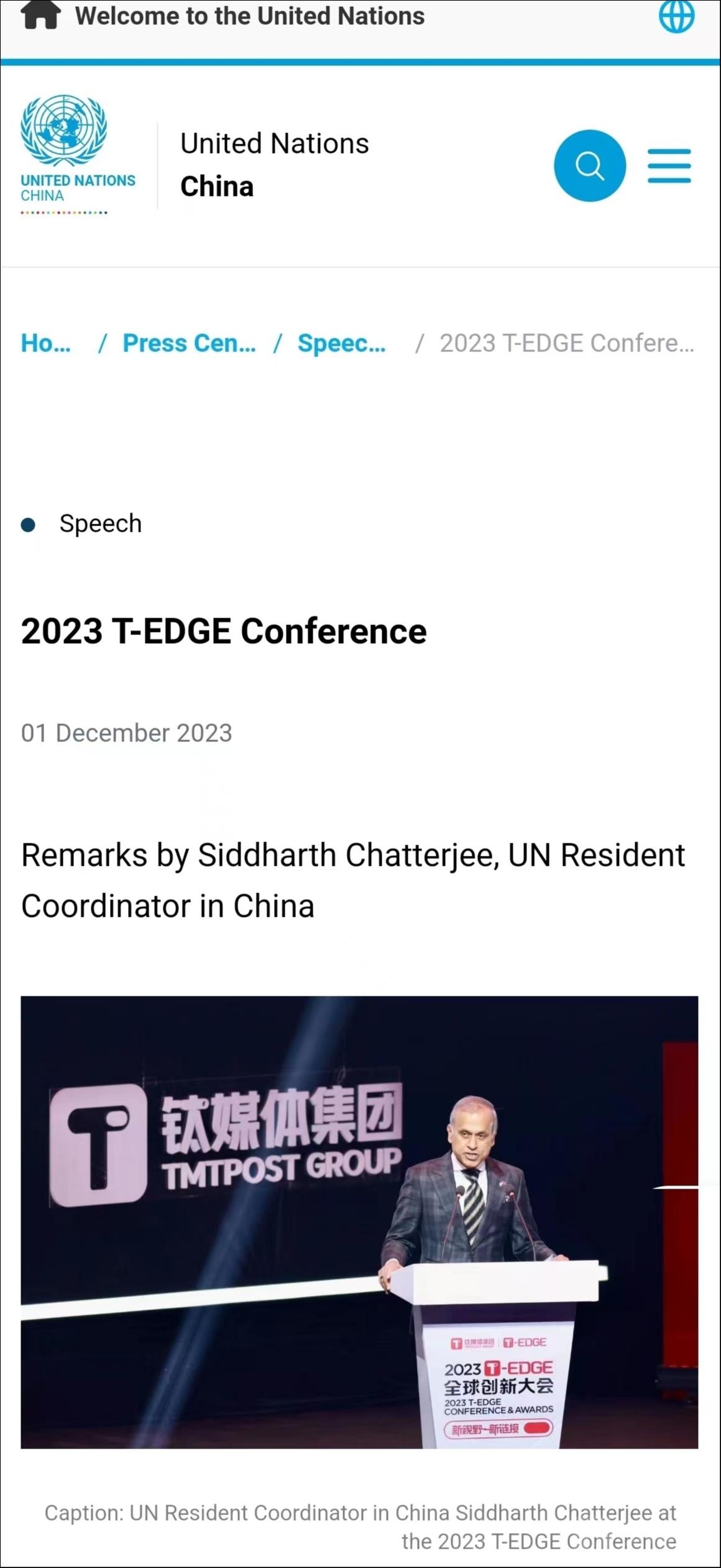 12月1日上午,联合国驻华协调员,Siddharth Chatterjee 常启德先生开场致辞,致辞《2023 T-EDGE Conference》英文全文已经发布到了联合国官方网站上。