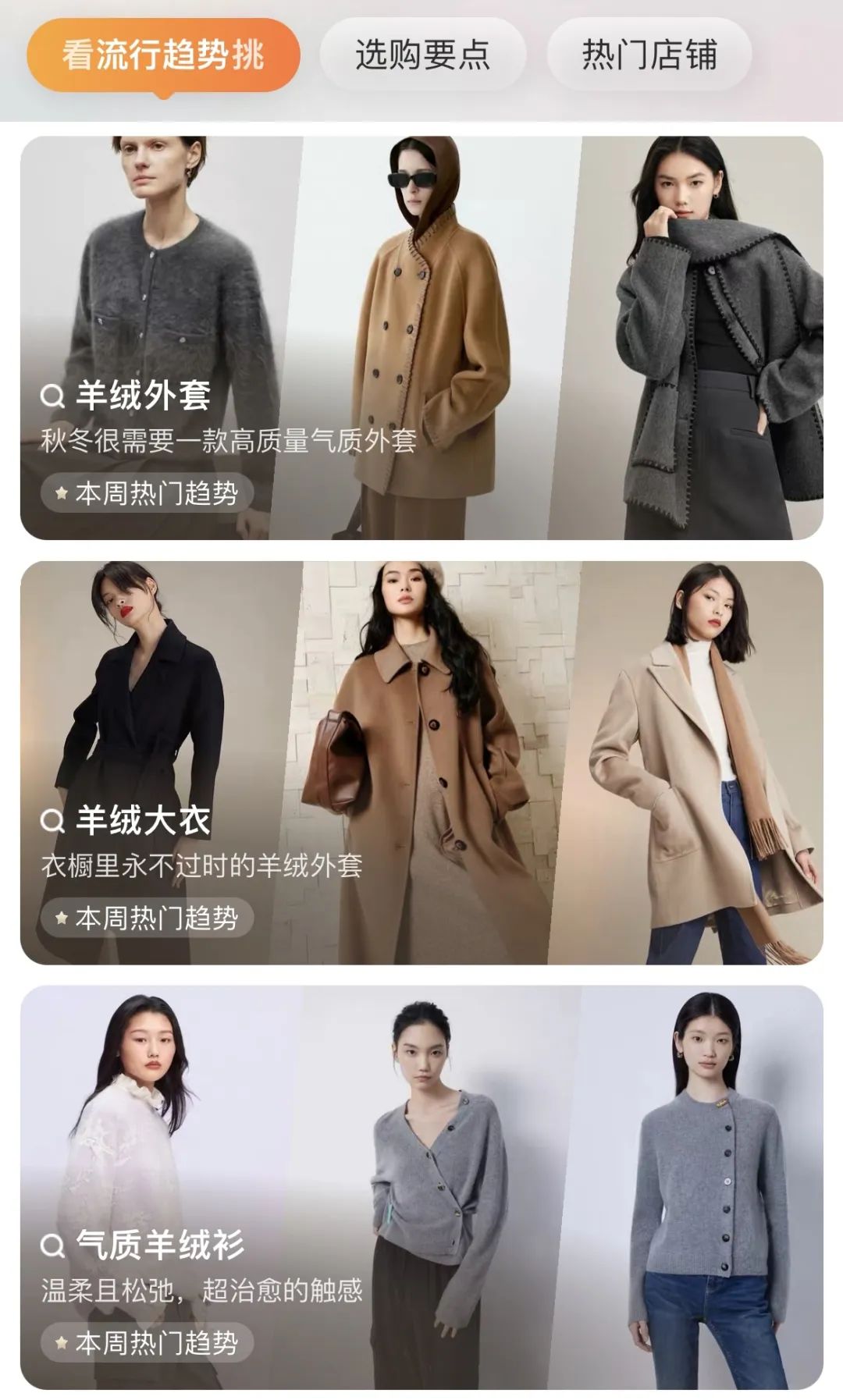 在淘宝#羊绒怎么挑 话题下,平台便从设计、风格和款式三个维度去给消费者提供选购要点。并且,在「看流行趋势挑」一栏中,经典舒适也成为参考标准之一。