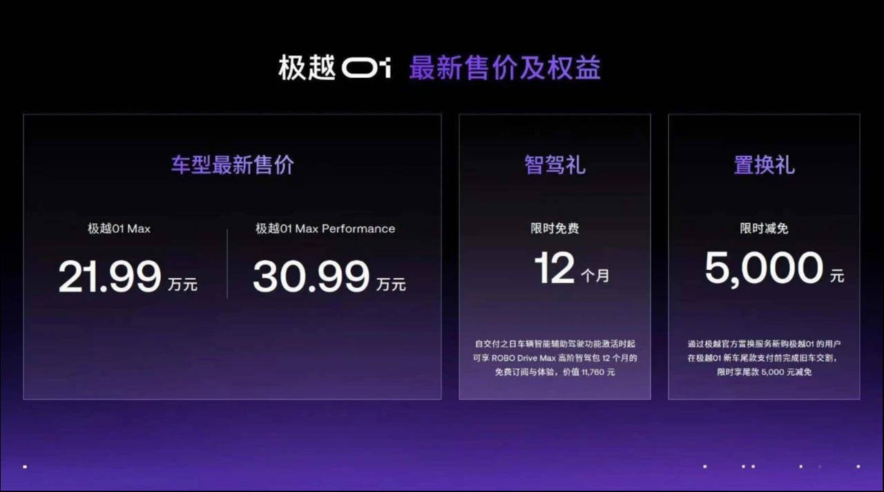但极越还不满足于此。11月30日,极越宣布推出新的价格政策和权益:即刻起,购买极越01全系车型(极越01 Max或极越01 Max Performance),将依照最新售价标准。另外,100kWh三元锂电池选装包优惠1万元(限时),极越01 Max的720km续航版本(即选配100kWh电池包)最高优惠4万元。