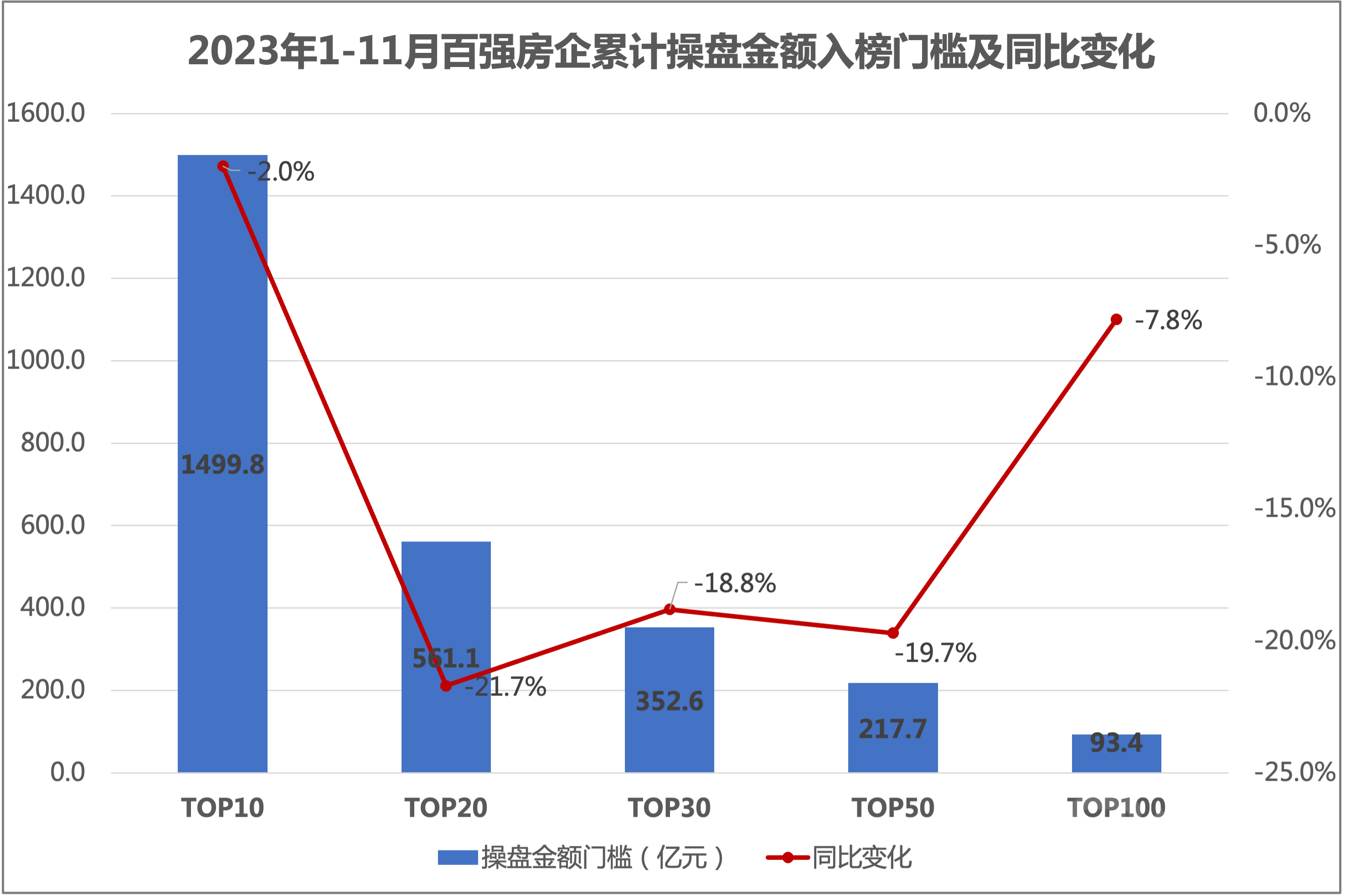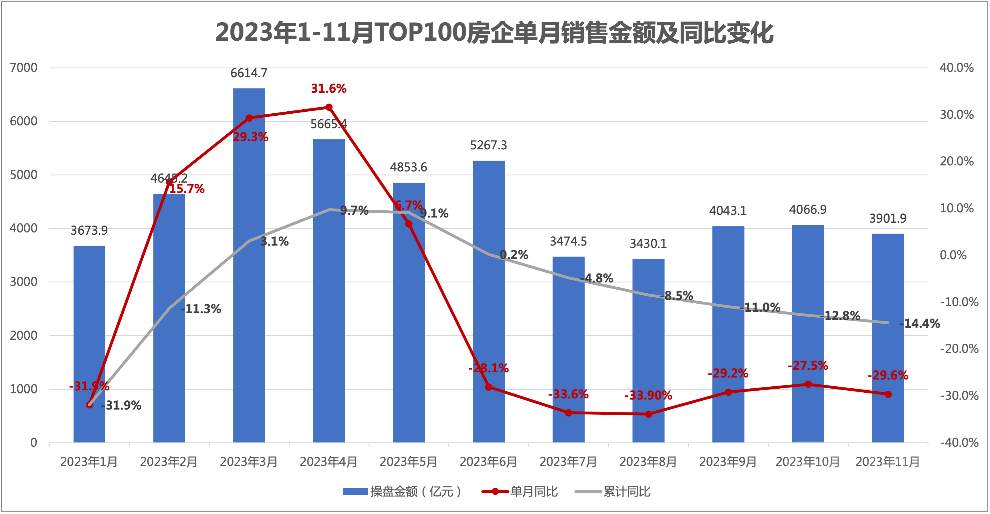 房企层面,据克而瑞最新统计, TOP100房企2023年11月单月操盘金额为3901.9亿元,环比降低4.1%,同比降低29.6%,同比降幅走扩且保持在较高水平。百强房企单月业绩规模延续下半年以来的低位。