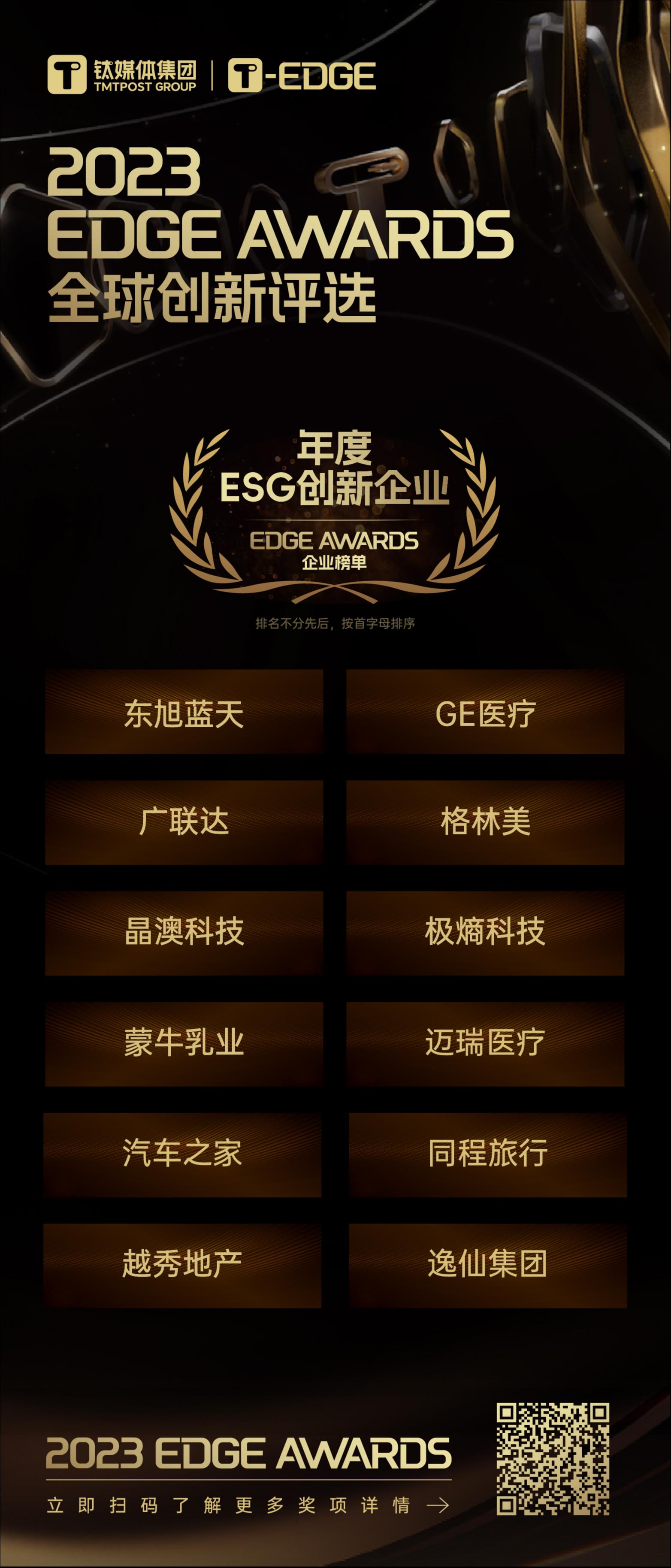 2023 EDGE AWARDS 年度 ESG 创新企业颁给 2023 年在 ESG 领域持续行动并做出卓越贡献、带来积极影响,对于可持续命题不断推陈出新,为行业起到引领作用的企业,上榜企业分别为:东旭蓝天、GE医疗、广联达、格林美、晶澳科技、极熵科技、蒙牛乳业、迈瑞医疗、汽车之家、同程旅行、越秀地产、逸仙集团。