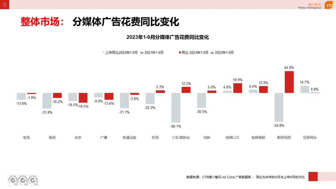 与之形成对照的是梯媒广告的强势增长,根据CTR数据,1-9月,电梯LCD和电梯海报的广告花费同比分别上涨19.9%和13.9%,这一势头还有持续上涨的趋势。