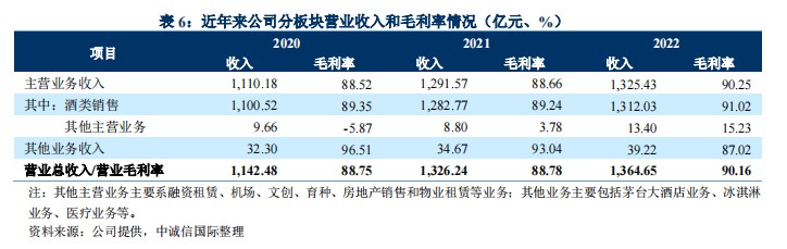 2022年,茅台文旅业务迎来关键的转折点。根据中诚国际发布的跟踪报告,2022 年茅台文旅业务实现营业收入和净利润 10.26 亿元和 1.7 亿元,同比分别大幅增长 372.76%和 475.64%。其中,文创、物业等被列为茅台集团其他主营业务,2022年收入13.4亿元,同比增长52%;茅台大酒店、冰淇淋等被列为其他业务,2022年收入39.22亿元。