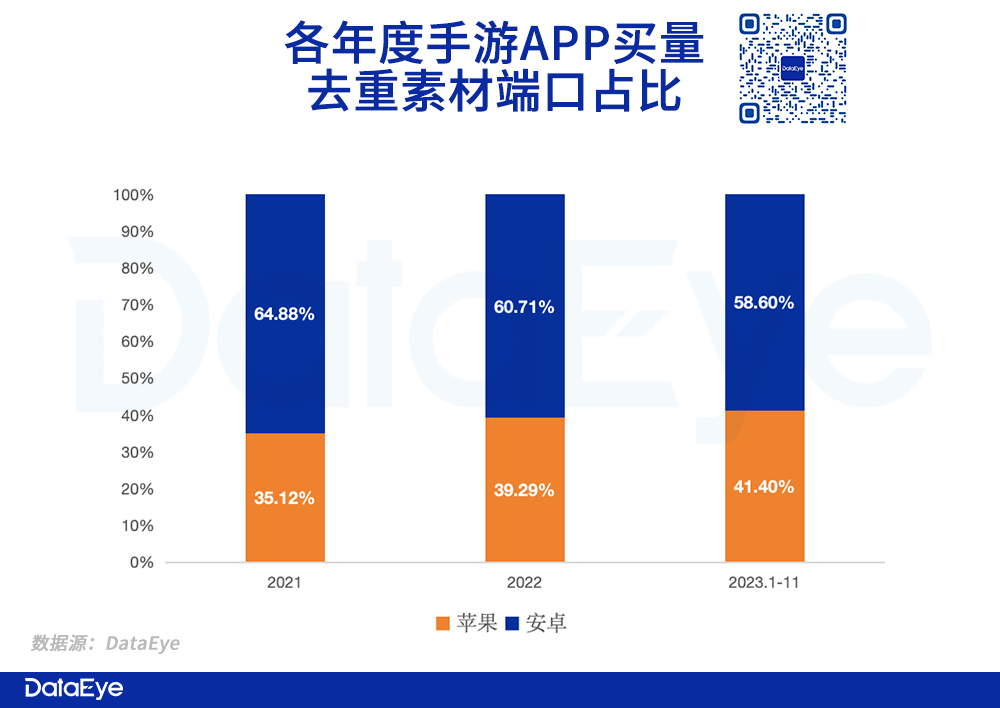 其一,买量投放方面:游戏行业在降本增效态势下,更倾向于优先获取付费情况更高的用户来提ROI,而不是以更低成本去获取付费偏低的用户——这也是字节腾讯流量平台所引导的。一般而言,苹果的用户付费能力,普遍高于安卓。DataEye ADX数据显示:2021、2022、2023年1-11月,游戏APP(不含游戏平台、小游戏)投放于苹果端的买量素材(去重后)占比为35.12%、39.29%、41.40%,占比逐年提升。