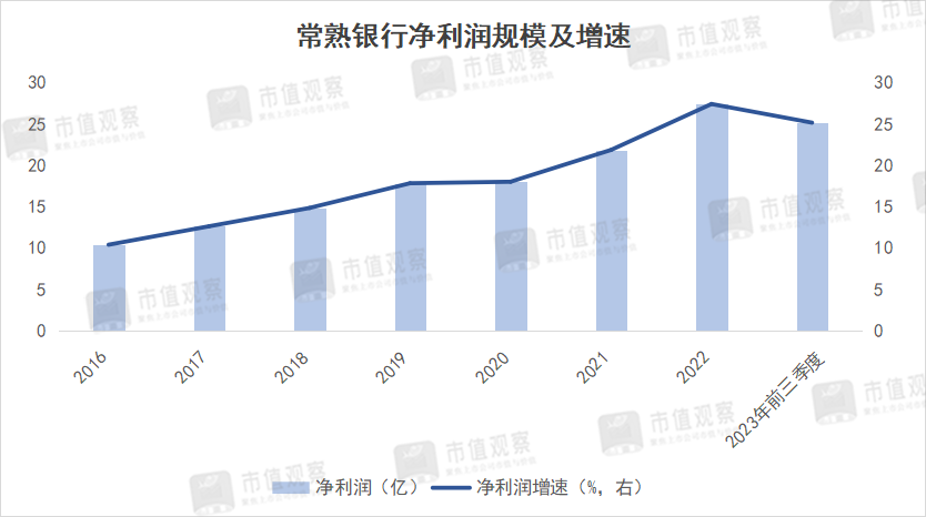 从业绩的角度来看,庄广强时代的常熟银行业绩增长较快,尤其是在他担任行长之后,净利润从2017年的12.64亿增长到2022年27.44亿,年度增速多保持在20%以上。