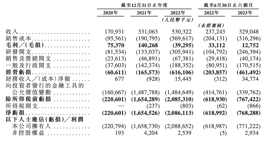 招股书显示,2020-2022年,速腾聚创收入分别约为1.71亿、3.31亿、5.30亿元,复合年增长率为76.2%;毛利分别为7537.0万、1.40亿、-3929.5万元。