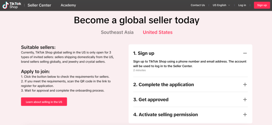 TikTok Shop招商网站,主推东南亚与美国地区 图源:TikTok Shop官网