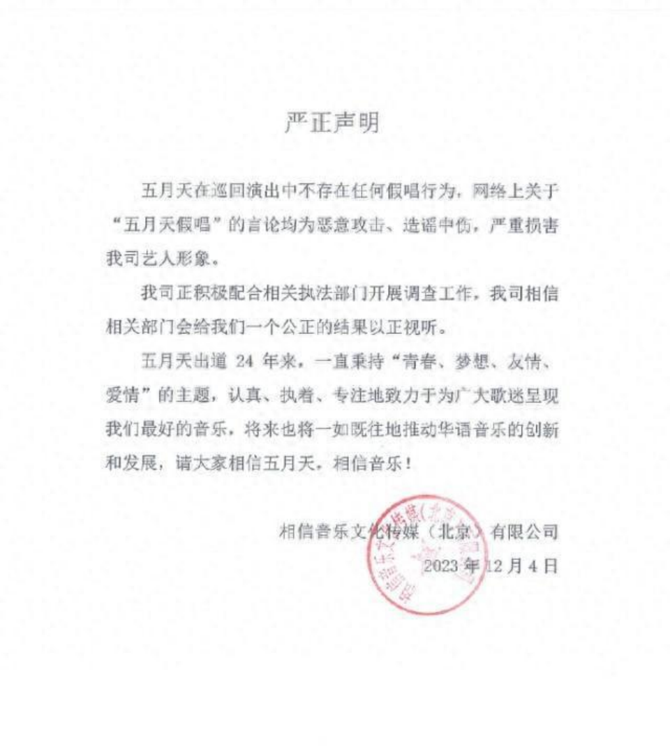 相信音乐称,五月天在巡回演出中不存在任何假唱行为,“网络上关于‘五月天假唱’的言论均为恶意攻击、造谣中伤,严重损害公司艺人形象。”目前,他们正积极配合相关执法部门开展调查工作,相信相关部门会给他们一个公正的结果以正视听。