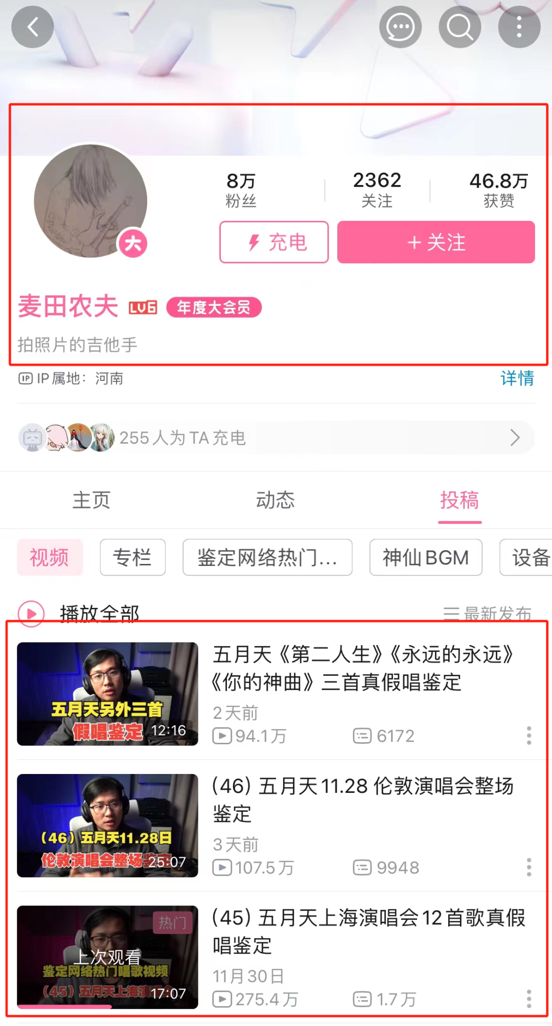 文娱价值官在B站上看到,“麦田农夫”是一位有8万粉丝的音乐UP主,早期在B站进行吉他演奏分享和教学,也做设备测评,后进行现场演唱的鉴定。此前他已经做过陈妍希、周深、李玉刚等歌手、明星的现场演唱。早期判定即使出现“假唱”情况,也并未引发大范围讨论,观看数据在2万左右。但是五月天演唱会的鉴定分析,最高观看量已经超过为200万。