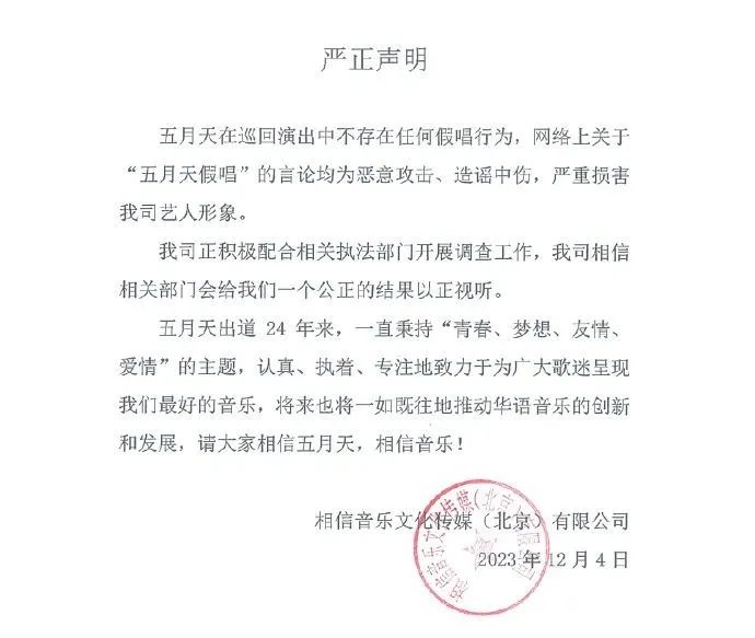 12月4日,五月天经纪公司相信音乐对外回应,称“巡演中不存在任何假唱行为”,并表示对造谣者进行追责。