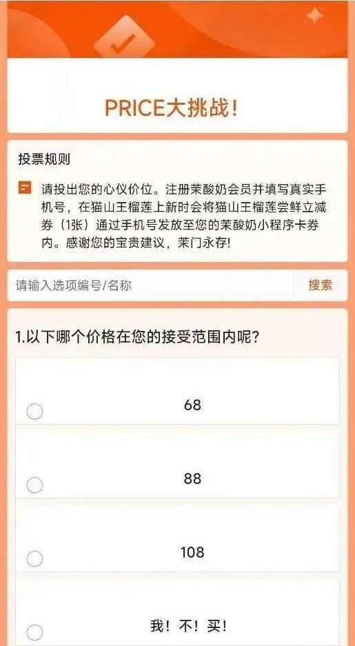 其次,2014年成立的茉酸奶一直不温不火,直到今年7月初因高价出圈。当时茉酸奶上线一份问卷调查,就新品“猫山王榴莲”系列向消费者征集价格,共有三档价位,分别为68元、88元和108元。此举瞬间引来了“酸奶刺客”“贵得离谱”等评论,同时,关于“茉酸奶到底是不是酸奶”的讨论也很激烈。