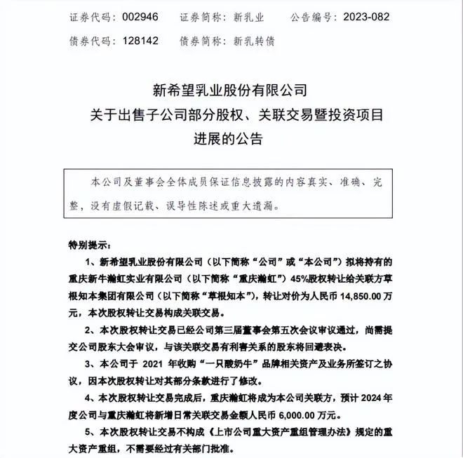 新乳业日前发公告称,拟将持有的重庆瀚虹45%股权转让给关联方草根知本集团有限公司(以下简称“草根知本”),此次转让对价为1.485亿元。