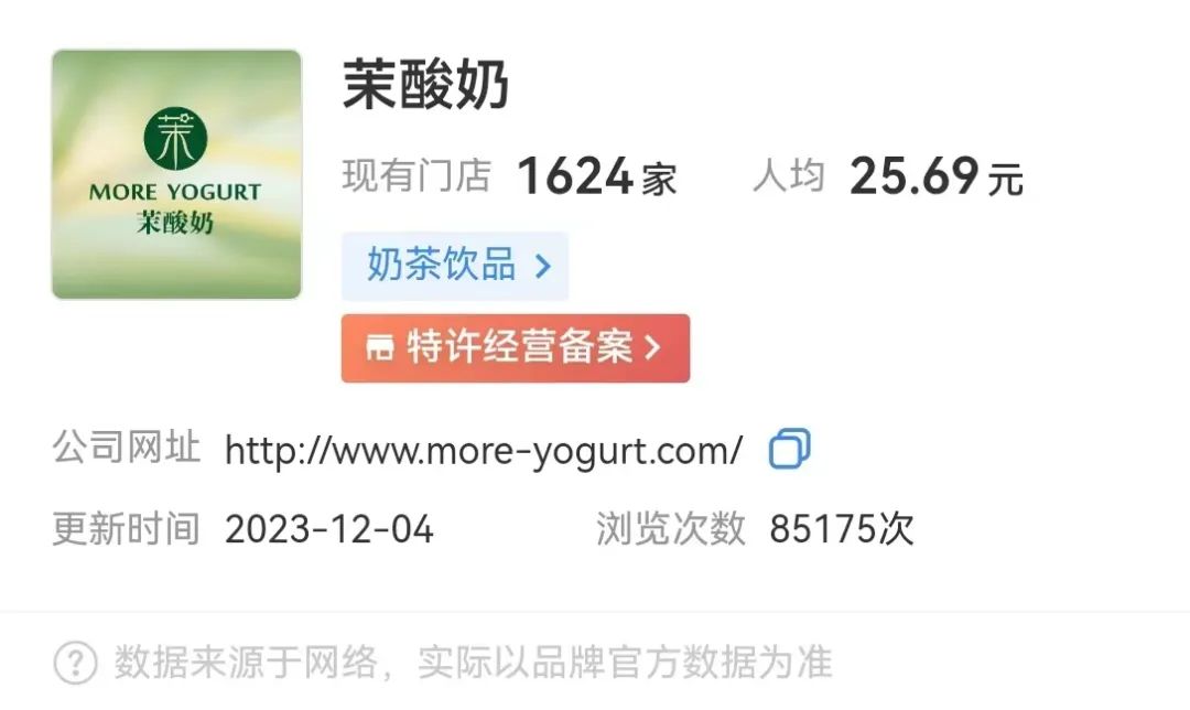 茉酸奶是目前国内最大的现制酸奶连锁企业。据窄门餐眼小程序统计,截至目前,茉酸奶拥有1624家门店。
