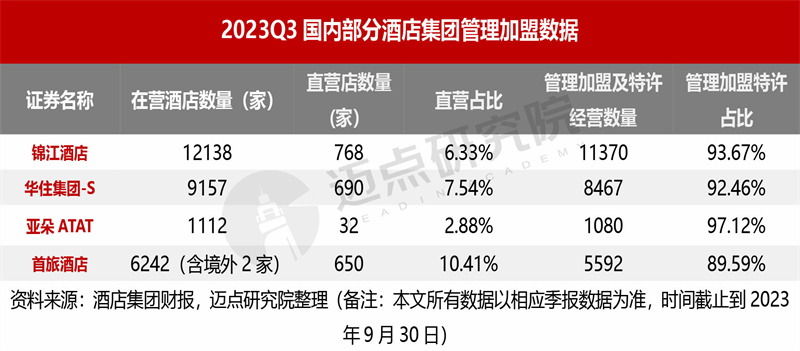 三季度,国内各大酒店集团持续扩大酒店规模,管理加盟和特许经营依然为其扩张发展的主导模式。截至到9月30日,华住、锦江、亚朵的管理加盟店占比均超90%,依次为92.46%、93.67%、97.12%。首旅酒店的管理加盟店占比相比上述三个集团略低,为89.59%,逼近90%,这与其推行“投资小、赋能高、回报快”特点的轻管理酒店扩张模式密切相关。