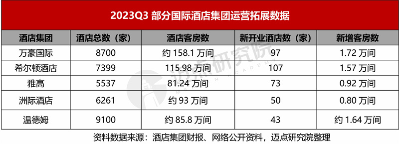 三季度,各大国际酒店集团持续在全球“跑马圈地”,新开业、新签约、筹建酒店不断,拓展其发展版图,客房数量持续攀升,如截至三季度末,万豪国际集团客房数超150万间、希尔顿酒店集团客房数超115万间。万豪、希尔顿和温德姆三家酒店集团,三季度新增客房数均超1万间。