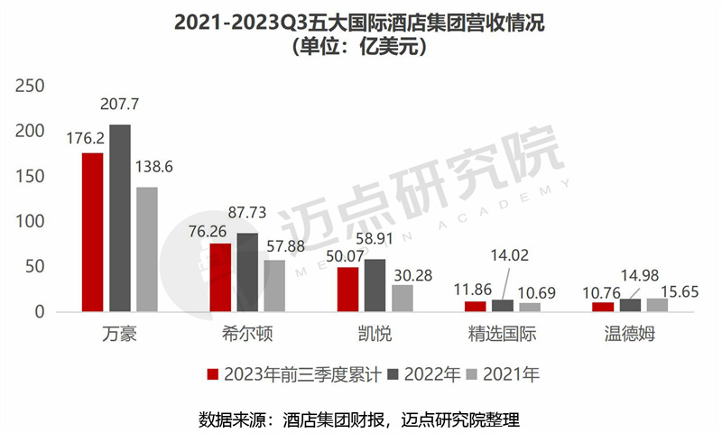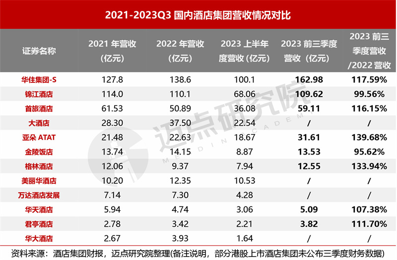 2.2023前三季度国内酒店集团营收情况:华住、首旅、亚朵等6家酒店集团前三季度营收超2022全年,赶超增长趋势明显