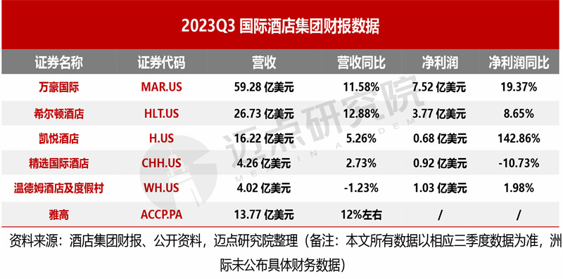 2023年第三季度,受益于国际旅游的复苏,全球酒店行业经营业绩回暖:6家国际酒店集团中,万豪国际营收59.28亿美元、净利润7.52亿美元,位列各集团之首,稳坐“头把交椅”。