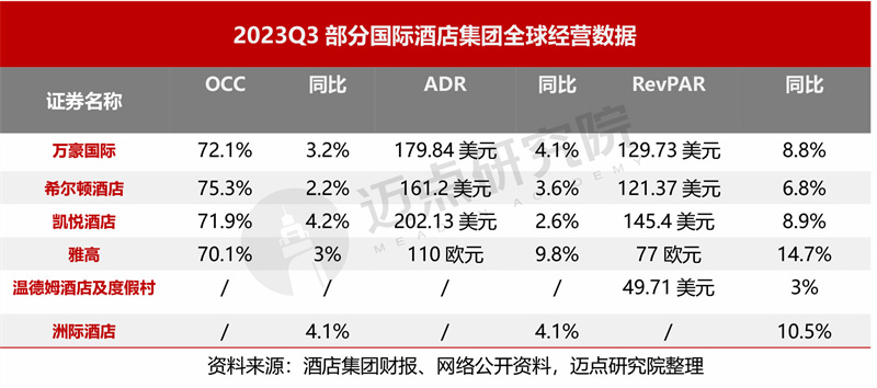 2023年三季度,得益于休闲、商务旅行的复苏及团体预订量的增长,各主要国际酒店集团的经营指标数据整体呈现同比正增长态势:以酒店RevPAR指标为例,雅高三季度整体的RevPAR同比增长约15%,高于预期;洲际酒店集团三季度整体RevPAR同比增长10.5%,相比2019年增长12.8%;万豪国际、凯悦酒店整体RevPAR同比增速约9%。