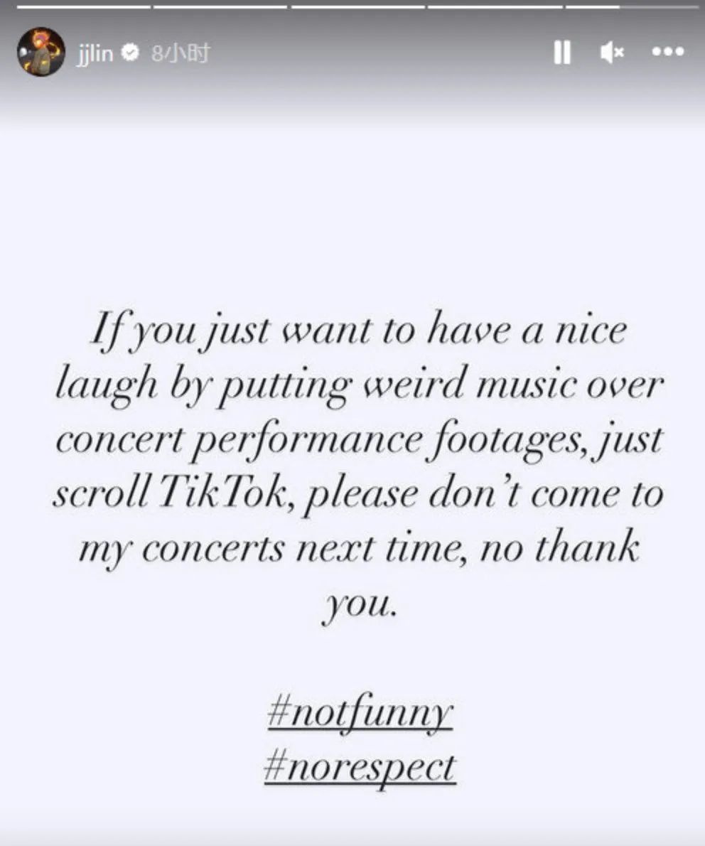 这不是演唱会近期唯一的暴雷事件。一起冲上热搜高位的,是林俊杰在Instagram上发布的一则快拍,表达了对其演唱会片段在短视频平台上被二次剪辑和恶搞的不满。这指向的,是演唱会屏摄问题的规范,及短视频对演唱会的影响。