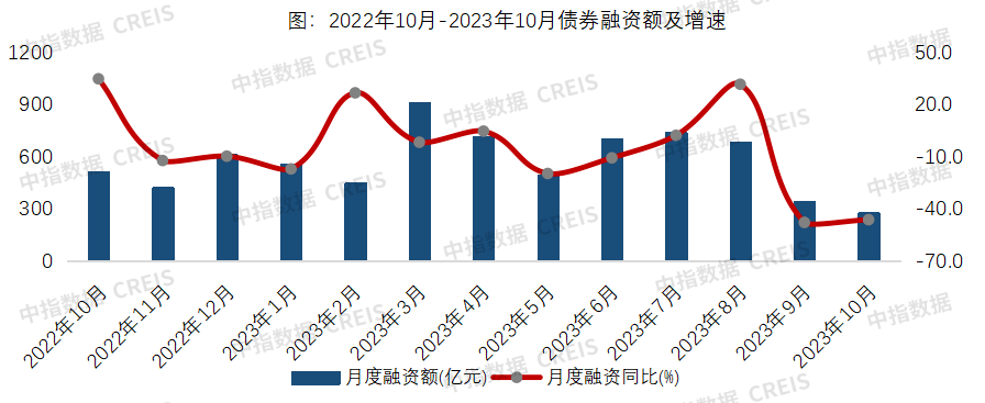 中指院数据显示,2023年1-10月,房地产企业债券融资总额为5875.1亿元,同比下降8.9%,其中,信用债融资3648亿元,同比降9.2%。