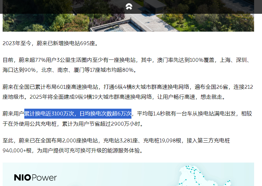 有关换电站的具体营收,蔚来的数据模糊而暧昧:10月25日,蔚来在官网宣布建成第2,000座换电站,在这篇报道中,蔚来称换电站“累计换电近3100万次,日均换电次数超6万次”。