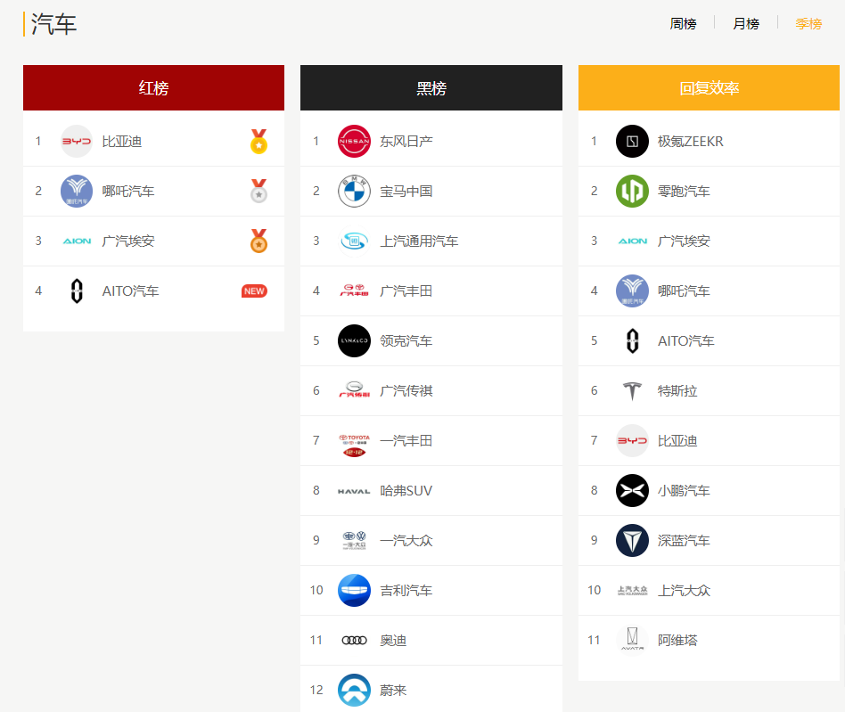 而蔚来引以为傲的高端服务,在黑猫投诉平台上,蔚来已经周榜月榜季榜中三榜蝉联,且名次越来越高,而蔚来的对手们则多是红榜上的常客。