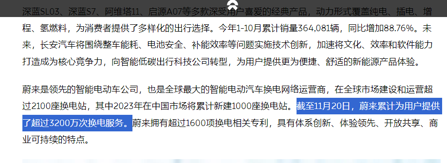 11月21日,蔚来与长安汽车在重庆联合官宣,双方签署换电业务合作协议。蔚来与长安将在推动换电电池标准建立、换电网络建设与共享、换电车型研发、建立高效的电池资产管理机制等方面展开合作。