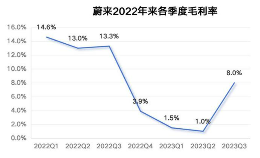 6月中旬,蔚来全系降价3万元,带动蔚来交付量在第三季度回升,其Q3财报显示,蔚来三季度整车毛利率回归两位数达11.0%,公司毛利率为8.0%,较今年Q1的1.5%和Q2的1%,取得较大提升。