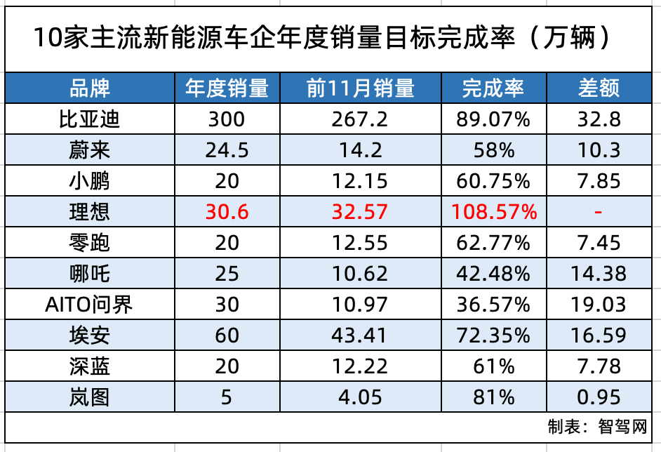 公开资料显示,主流的10家新能源车企中,仅有理想提前完成了年度销量目标;月销30万辆的比亚迪,距离300万辆年度目标仍有32.8万辆的缺口,且在上月亮出优惠活动后,11月销量仅比10月增加了70辆,12月仍有不小的冲刺压力;岚图虽然只制定了5万辆的年度目标,但时至12月仍然还有接近1万辆的待完成指标。虽然销量目标没有亮眼成绩,但上述3家已是主流新能源车企中,年度目标完成率前三名,市场供需关系也由此可见一斑。
