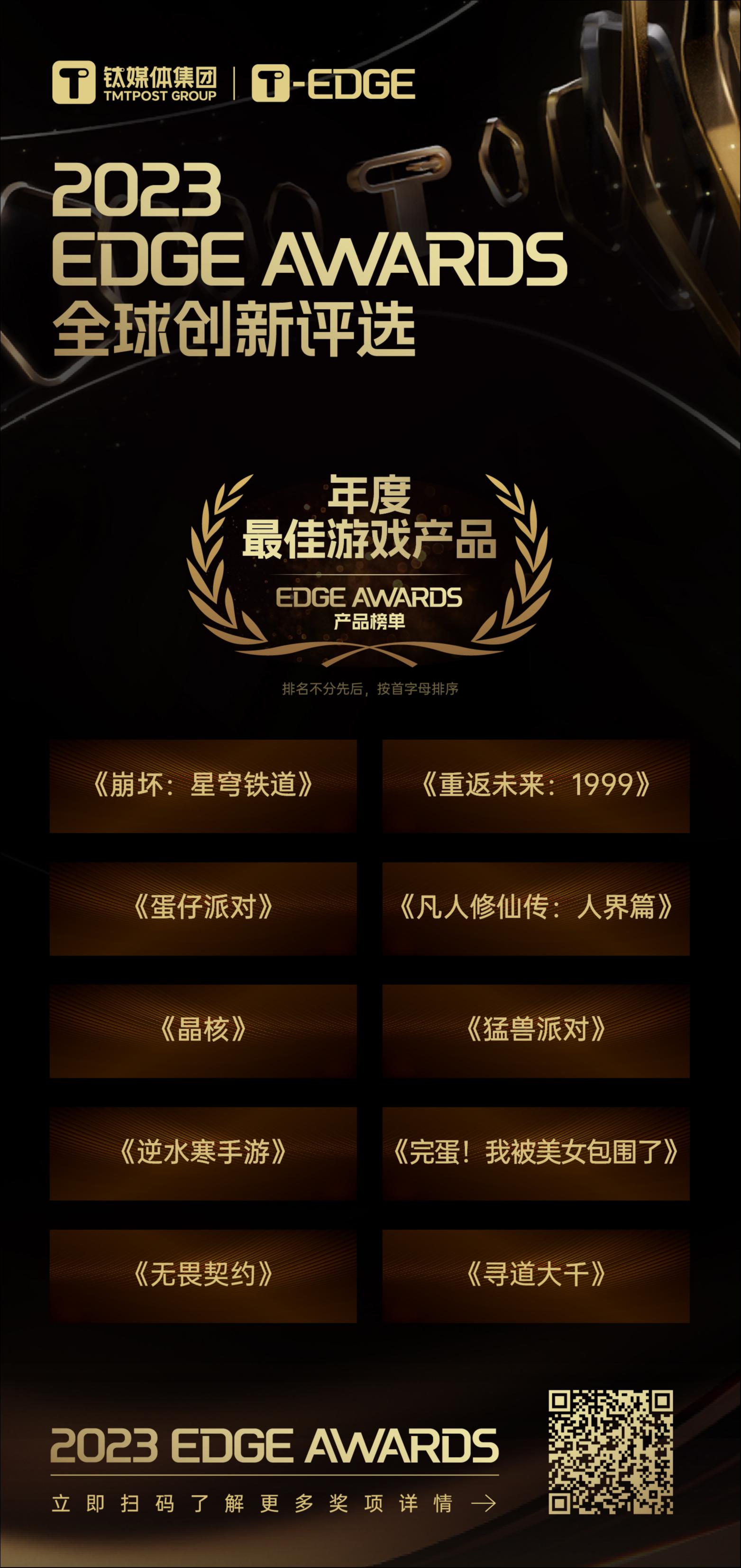 在充满竞争和挑战的游戏市场中,《崩坏:星穹铁道》《重返未来:1999》《蛋仔派对》《凡人修仙传:人界篇》《晶核》《猛兽派对》《逆水寒手游》《完蛋!我被美女包围了》《无畏契约》《寻道大千》,被钛媒体EDGE AWARDS认定是2023年度“年度最佳游戏产品”。相信这是对这些作品的一种高度肯定。