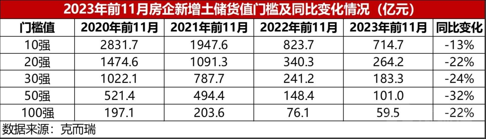各梯队的门槛值同比均下跌,10强门槛值降幅最小,同比下降13%,50强门槛值降幅最大,同比下降32%;百强门槛为59.5亿元,较10月末增加3.8亿元,同比下降22%。