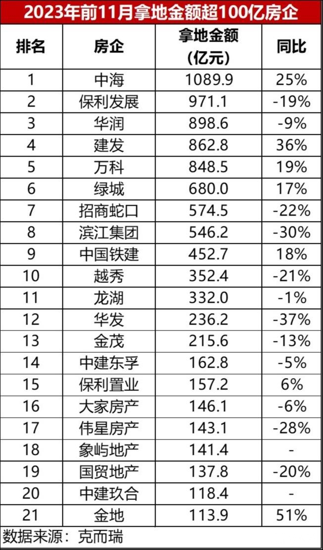 克而瑞数据显示,前11月房企投资格局以央国企为主,百强房企拿地金额超过100亿的房企共21家,14家为央国企、5家民企、2家混合制房企。其中,建发和中海不仅拿地金额较高,投资金额较2022年同期上涨幅度较大,同比涨幅分别为36%、25%。
