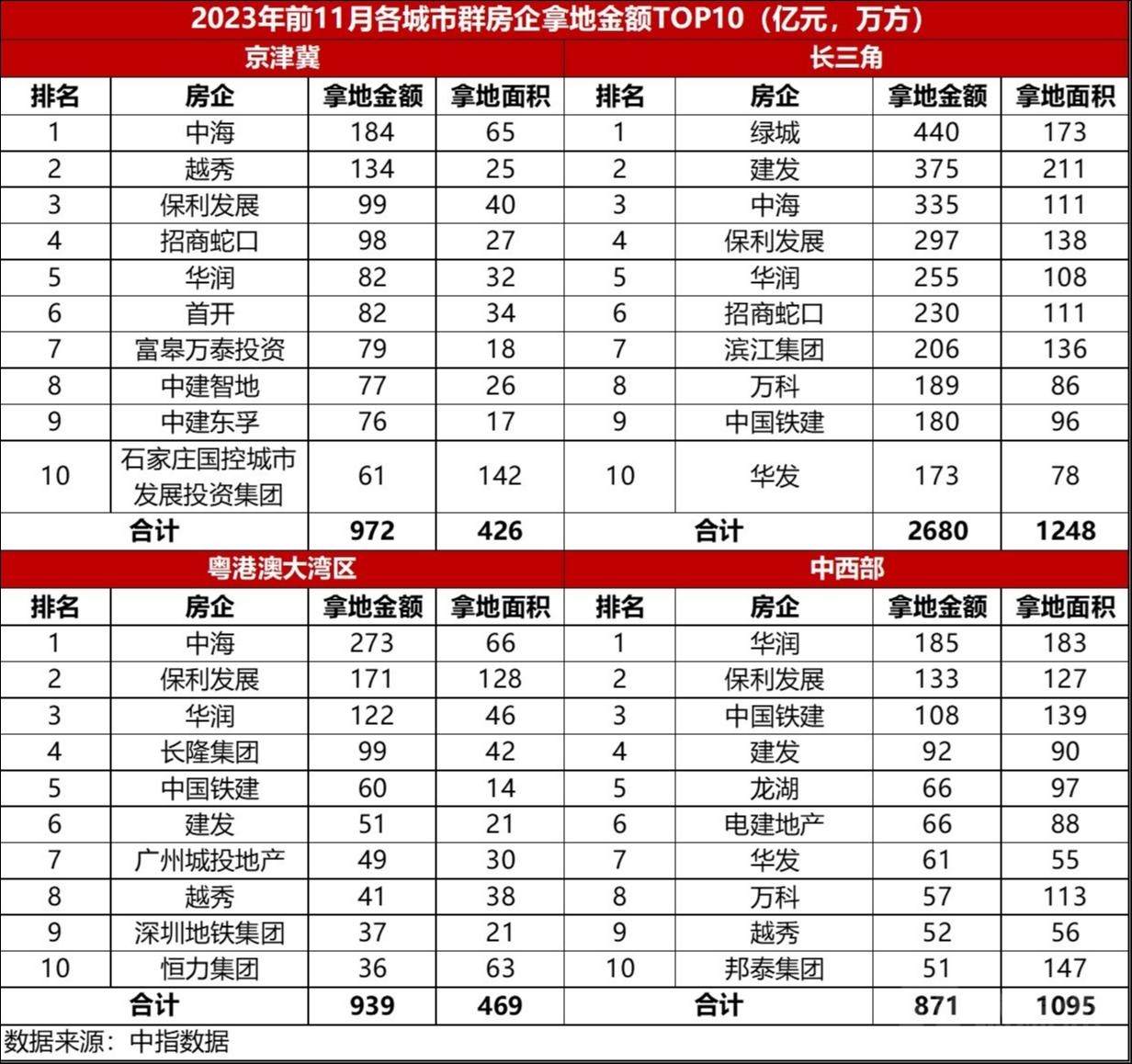 从各城市群拿地金额来看,长三角地区依然领跑全国。根据中指数据统计,1-11月,长三角TOP10企业拿地金额2680亿元,居四大城市群之首。其中,绿城拿地金额为440亿元,位居长三角企业拿地金额榜首;京津冀TOP10企业拿地金额972亿元,反超粤港澳大湾区位列第二;粤港澳大湾区TOP10企业拿地金额939亿元,位列第三。
