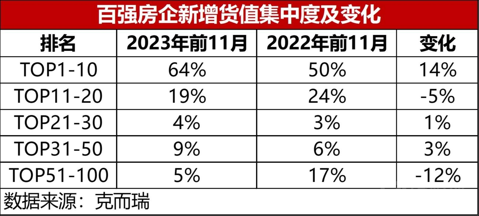 克而瑞数据显示,截至11月末,10强房企新增货值占64%,这一数据在2022年前11月是50%,意味着,10强房企2023年集中度进一步走高。与之相对应的是,TOP10之外的其他各梯队,新增货值占比则相应减少,各梯队的新增货值占比变化幅度基本保持在5%以内,仅TOP51-100梯队新增货值占比减少了12%。此外,截止11月末,仍有近五成销售百强房企未拿地。